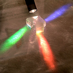The prism block of a Foveon digital camera. White light enters at the top and is split into its component red, green and blue. |