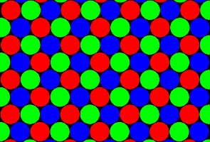 A 'shadow mask' television screen (cathode ray tube) greatly enlarged to show the structure. All the Red, Green and Blue elements are glowing equally and at maximum. At normal viewing distance this screenful would look white. |