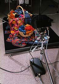 I wanted to choose one of the most difficult subjects I could find and I did not need to look any further than home. My wife, Paulien, is a knitwear designer. She spins her own wool from fleece which she dyes using natural substances. The colours are brilliant but fall in difficult areas of the spectrum, the fleece provides very fine detail at random angles. We arranged the fleece in a wicker basket, to get some specular highlights in the picture. This sat on a bed of finished knitwear, the patterns of knitting in which might cause interference patterns with the regular laid out serried ranks of pixels on the CCD.