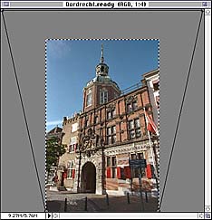 Photoshop displays the chosen image at the largest size possible, up to 1:1, while fitting it all on screen. Large images are scaled down by the amount shown in the image title bar, so that the full image can be seen. My Dordrecht image says '1:3'. This means that the image is so large that only every third pixel can be displayed on the screen. Pixel one is displayed, two and three not, four is displayed, five and six not, seven is displayed and so on. The pixels are still in the image, they're just not displayed. Missing out pixels can make the image look as though it has aliasing - 'the jaggies' on diagonal lines - and can fool you when evaluating such things as noise (digital's grain equivalent) and definition. Images are best evaluated and worked on by zooming in to 1:1 - one pixel displayed in one element of the screen. A shortcut to this is to double click the Zoom tool. The image will then overfill the screen and you will need to use the Hand tool to pan it around to see it all. To select the Hand tool temporarily, hold down the space bar. Then click and hold the mouse button while dragging the image around on screen. To see the whole image on screen again, double click the Hand tool.