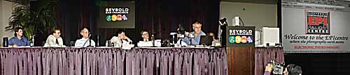 This is the session in full swing with, from left to right, Michael Hopwood (Eastman Kodak); Rick Casey (Casio); Fred Shippey (Future Image Reports); Eran Steinberg (Obsidian Imaging); Jeff Rapson (Highwater Designs) and John Henshall demonstrating a new digital camera. On the table in front of him are new digital cameras from Obsidian Imaging, Pixera Corporation, Casio (QV-100), Olympus (D-300L) and Fuji (DS-7). Perched on the podium is Fuji's new AS-1 scanner for APS film. Digital 'joiner' (from six separate shots taken on a Fuji DS-505) by Brian Whitehead FBIPP.
