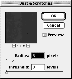 Up pops a floating box with a little preview window and a couple of controls. Click on the main image and that part of it appears in the little box. First I tried a Radius setting of 1 pixel. It wasn't enough to get rid of the dust on the picture, so I tried 2 pixels then 3, which was.